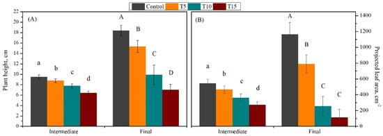 Growth characteristics of basil leaves grown under the various salinity treatments: plant height at the intermediate and final harvests (A); projected leaf area at the intermediate and final harvests (B). Values are expressed as mean ± standard deviation (n = 50 for plant height and n = 10 for the PLA). Different letters indicate statistically significant differences between treatments at each harvest (small letters refer to the intermediate and capital ones to the final harvest, p < 0.05).