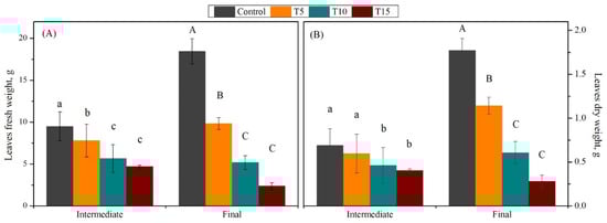 Leaves fresh weight (A) and leaves biomass (B) grown under the various salinity treatments at the intermediate and final harvests. Values are expressed as mean ± standard deviation (n = 10). Different letters indicate statistically significant differences between treatments at each harvest (small letters refer to the intermediate and capital ones to the final harvest, p < 0.05).