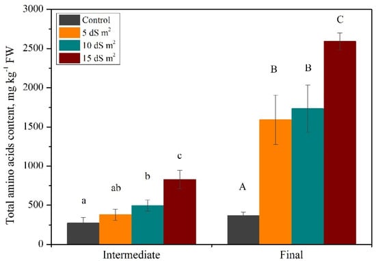 Total amino acid content of basil leaves grown under the various salinity treatments at the intermediate and final harvests. Values in all layers are expressed as mean ± standard deviation (n = 5). Different letters indicate statistically significant differences between treatments at each harvest (small letters refer to the intermediate and capital ones to the final harvest, p < 0.05).