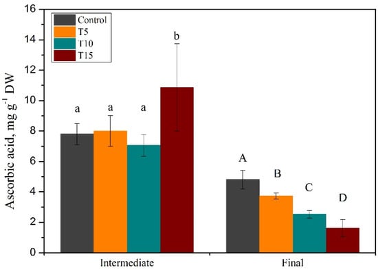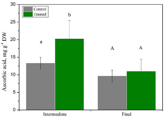 Ascorbic acid content of basil leaves grown as a secondary crop in the second experiment at the intermediate and final harvests. Values are expressed as mean ± standard deviation (n = 5). Different letters indicate statistically significant differences between treatments at each harvest (small letters refer to the intermediate and capital ones to the final harvest, p < 0.05).