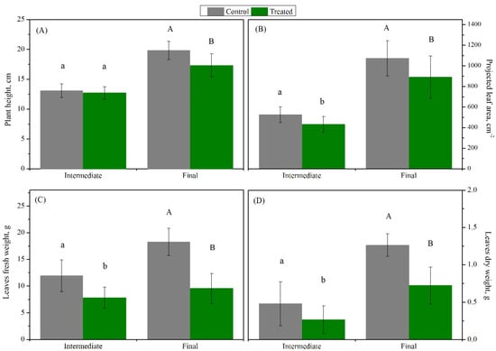 Growth characteristics of basil leaves grown as a secondary crop in the second experiment: plant height (A), projected leaf area (B), leaves fresh weight (C), and leaves biomass (D) at the intermediate and final harvests. Values are expressed as mean ± standard deviation (n = 50 for plant height and n = 10 for all the others). Different letters indicate statistically significant differences between treatments at each harvest (small letters refer to the intermediate and capital ones to the final harvest, p < 0.05).