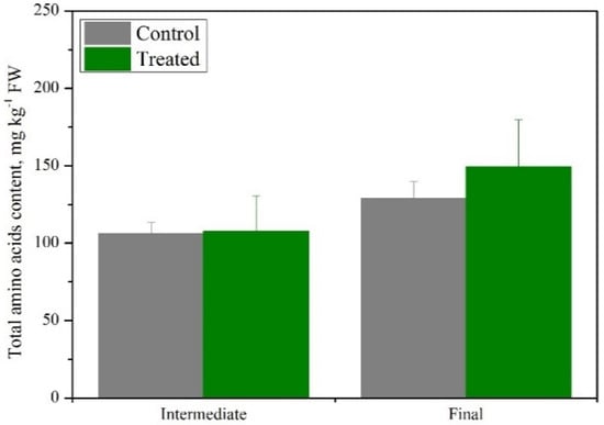 Total amino acid content of basil leaves grown as a secondary crop in the second experiment. The absence of letters indicates no statistically significant differences between treatments at both harvests (p < 0.05). Values are expressed as mean ± standard deviation (n = 5).