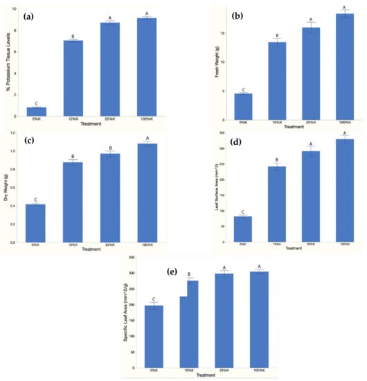16]. Neither of these prior studies included a 0% K treatment across the entire duration of the growth period. Quantifying the maximum amount of potassium that can be removed under experimental conditions is important because this will provide a baseline for researchers to use to understand how their unique potassium restriction methods compare when 0% K is included as a growing treatment.