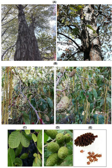 Alnus nitida (Spach) Endl. plant and its various parts. (A) Woody tree with dark red bark, (B) A. nitida tree bearing catkins and cones, (C) A. nitida leaves, (D) A. nitida cones, and (E) mature cone with seeds.