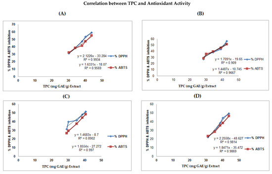 Correlation between total phenolic content in the methanolic extracts of A. nitida various parts (leaves, stem bark, seeds, and roots) versus percent antioxidant activity. The regression values are; (A) leaves (DPPH, R2 = 0. 9934; ABTS, R2 = 0.9569), (B) stem bark (DPPH, R2 = 0. 909; ABTS, R2 = 0.9667), (C) seeds (DPPH, R2 = 0. 8902; ABTS, R2 = 0.997), and (D) roots (DPPH, R2 = 0. 9814; ABTS, R2 = 0.9869).