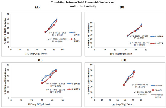 Correlation between total flavonoid in the methanolic extracts of A. nitida various parts (leaves, stem bark, seeds, and roots) content versus percent antioxidant activity. The regression values are; (A) leaves (DPPH, R2 = 0. 9932; ABTS, R2 = 0.9686), (B) stem bark (DPPH, R2 = 0.979; ABTS, R2 = 0.9929), (C) seeds (DPPH, R2 = 0. 9273; ABTS, R2 = 0.9733), and (D) roots (DPPH, R2 = 0. 9673; ABTS, R2 = 0.9323).