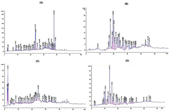 HPLC chromatograms of various parts of A. nitida: (A) leaves, (B) stem bark, (C) seeds, and (D) roots.
