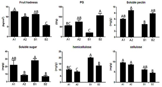 Through the analysis of the physical and chemical properties of A144 and A361, we found that the fruit hardness and contents of soluble sugar, hemicellulose, cellulose, and polygalacturonase (PG) were significantly different between the two lines and between before and after storage (Figure 1). Specifically, fruit firmness and contents of soluble sugar, cellulose, and hemicellulose were decreased in A2 (A144 at 3 days postharvest) and B2 (A361 at 3 days postharvest) compared with A1 (A144 at 0d) and B1 (A361 at 0d), but the decrease in B2 was greater than that in A2 (Figure 1). The opposite was true for PG and soluble pectin. The contents of PG and soluble pectin in A2 and B2 were significantly higher than those of A1 and B1, and the increase in B2 was greater than that in A2.