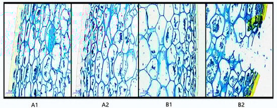 Paraffin section of pepper before and after storage. Annotation: A1 represents A144 material stored for 0 days; A2 represents A144 material stored for 3 days; B1 represents A361 material stored for 0 days; B2 represents A361 material stored for 3 days.