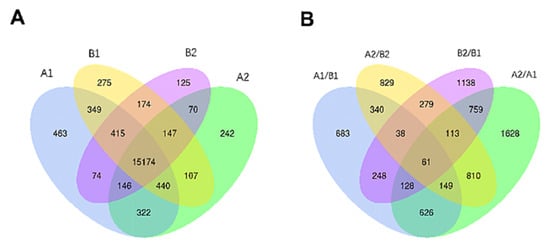 From Illumina Nova 6000 sequencing, we obtained more than 5G of sequencing data and a total of 516,522,132 raw reads. After removing the linker sequence, low-quality sequences, and rRNA, 509,298,534 clean reads were obtained. The clean reads were aligned to the reference genome, and more than 87% of all samples were successfully matched to the reference genome. After the alignment, a total of 23,477 genes were identified, from which 18,523 genes were quantified. Among the quantified genes, 15,174 genes were present in all samples, and there were 463, 242, 275, and 125 unique genes in A1, A2, B1, and B2, respectively (Figure 3A).