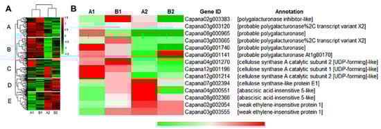 Through cluster analysis, the gene expression patterns of A1, B1, A2, and B2 were divided into two categories, and the expression patterns in each category were consistent (Figure 4A). In the A and B groups, the gene expression of A1 and B1 showed an upregulation trend, and the gene expression of A2 and B2 showed a downregulation trend; in the D and E groups, the gene expression of A1 and B1 showed a downregulation trend, and the gene expression of A2 and B2 showed an upregulation trend. However, in group C, the gene expression of B1 and B2 were both downregulated, but most of the genes in A1 and A2 were upregulated. Therefore, we hypothesized that these genes might contain key genes for the storage tolerance of pepper. Next, we screened out 14 storage-related genes that exhibited differential expressions after harvesting the two pepper materials, including polygalacturonase (PG), polygalacturonase inhibitor (PGI), cellulose synthase (CESA), abscisic acid insensitive (ABI) and, weakly ethylene-insensitive (WEI) genes (Figure 4B). Among them, the expression level of PG (Capana06g001141) in A2 fruit was significantly lower than that in B2, and its expression level in A2 was significantly lower than that in A1, while B2 was not significantly different from B1. The expression levels of ABI5 (Capana04g000551 and Capana08g002366) and WEI1 (Capana02g002054) in A2 were significantly higher than those in A1, but no significant difference was found between B1 and B2 fruits. The expression levels of PGI (Capana02g003383) and CESA (Capana07g002394), which inhibit pepper fruit softening, were all significantly higher in A2 compared to B2. These results suggest that the differential expression of the above genes might be the important reason for the difference in storage tolerance of the two pepper materials.