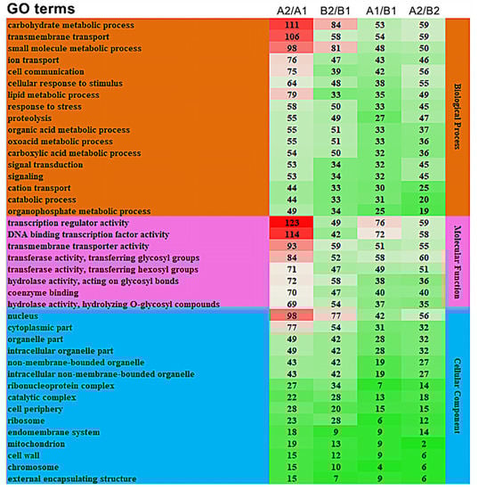 We performed further enrichment analysis on the top 40 GO terms containing the largest number of differentially expressed genes. The results show that in the biological processes class, carbohydrate metabolic process (GO:0005975), transmembrane transport (GO:0055085), and small molecule metabolic process (GO:0044281) were significantly enriched in A2/A1, B2/B1, A1/B1, and A2/B2, and each functional item had the highest degree of enrichment in A2/A1 (Figure 5). In the molecular functions class, the transcription regulator activity (GO:0140110), DNA binding transcription factor activity (GO:0003700), and transmembrane transport activity (GO:0022857) were significantly enriched in all the four comparison groups, and the transcription regulator activity (GO:0140110) process was significantly enriched in A2/A1. The cellular components class was divided into 14 categories. The most significantly enriched processes in the comparison groups were the nucleus (GO:0005634) and cytoplasmic parts (GO:0044444). Therefore, the GO enrichment in carbohydrate metabolic process (GO:0005975), transcription regulator activity (GO:0140110), and DNA binding transcription factor activity (GO:0003700) might be the reason for the difference in storage tolerance between A144 and A361.
