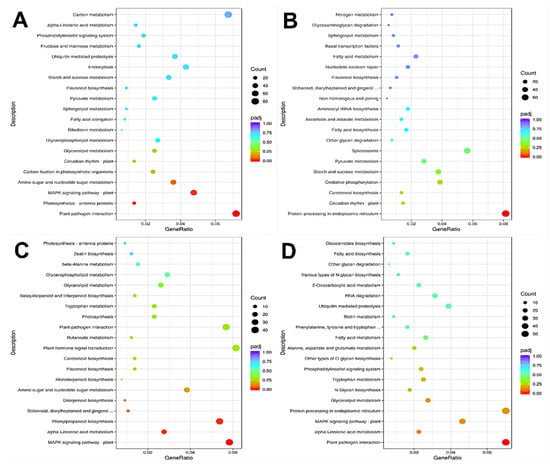 KEGG pathway enrichment analysis was performed on the differentially expressed genes (DEGs) in each comparison group. The results show that the DEGs in A2/A1 fruits were significantly enriched in photosynthesis-antenna proteins, plant–pathogen interaction, and MAPK signaling pathway-plant pathways (Figure 6A). The DEGs in the B2/B1 fruits were significantly enriched in the protein processing in the endoplasmic reticulum pathway (Figure 6B). The DEGs in A1/B1 were significantly enriched in plant MAPK signaling pathway-plant, alpha-linolenic acid metabolism, and phenylpropanoid biosynthesis pathway (Figure 6C), while the DEGs in A2/B2 were significantly enriched in plant–pathogen interaction pathway (Figure 6D). These results show that these fruits might be regulated by phytohormone signal transduction and protein synthesis-related genes. The enrichment in plant MAPK signal transduction and phytopathogen interaction pathways in A2/A1, A1/B1, and A2/B2 groups indicates that the above enriched pathways might be the cause of the difference in storage tolerance.
