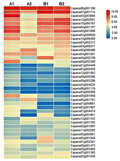 ERFs are important factors regulating plant growth and fruit ripening. In this study, we identified a total of 116 ERFs, of which 77 were quantified (Table S1). We further analyzed 40 ERFs with FPKM value > 5 (Figure 7). Among them, the expression of ERF1B-like (Capana05g001701) was significantly increased by 2.9 times in A2/A1, but there was no significant difference between B2 and B1, and its expression in A2 was significantly higher than that in B2. The expression levels of ERF3-like (Capana10g000161) and ERF096-like (Capana02g001898) in A2 fruits were significantly lower than those in A1 by 2.35 and 3.89 times, while there was no significant difference between B1 and B2; moreover, the expression levels of ERF3-like and ERF096-like in A2 were significantly lower than those in B2. The expression level of ERFRAP2-13-like (Capana04g001107) in A2 and B1 fruits was significantly lower than that in A1, and the expression level of A2 was significantly lower than that of B2. The differential expression of genes such as ERF1B-like, ERF3-like, and ERF096-like might be the reason for the difference in storage tolerance of the two pepper materials.