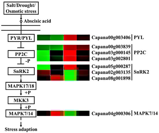 Our study found that a large number of genes in the abscisic acid (ABA) plant hormone signaling pathway were differentially expressed in each comparison group (Figure 8). In the two pepper materials, most genes were upregulated after storage for 3 days, such as abscisic acid receptor PYL (PYL) (Capana00g003406), protein phosphatase 2C (PP2C) (Capana00g003839 and Capana03g002801), and protein kinase 2 (SnRK2) (Capana05g000287), among which PYL had the largest increase, and A2/B2 had significantly higher expression levels of these genes than A1/B1. However, protein kinase 2 (SnRK2) (Capana08g001898 and Capana02g003135) and mitogen-activated protein kinase 7/14 (MPK7/14) (Capana04g000306) showed different trends. The expression of protein kinase 2 (SnRK2) (Capana08g001898 and Capana02g003135) and MPK7/14 (Capana04g000306) in A2 was significantly downregulated compared to A1, while in B2, onlySnRK2 (Capana08g001898) and MPK7/14 (Capana04g000306) were downregulated as compared to B1; moreover, the expression of SnRK2 and MPK7/14 in A2 was significantly lower than that in B2. These results indicate that PP2C, SnRK2, and MPK7/14 might be closely related to the storage tolerance of pepper.