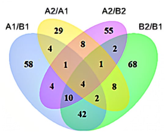 Venn analysis of different metabolites. Annotation: A1/B1 means A1 compared to B1; A2/B2 means A2 compared to B2; B2/B1 means B2 compared to B1; A2/A1 means A2 compared to A1.