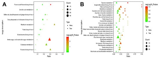 Pearson correlation analysis was performed between the significantly different genes obtained by transcriptome analysis and the significantly different metabolites obtained by metabolomics analysis in order to measure the degree of correlation between the differential genes and metabolites. The top 50 differential metabolites and the top 100 differential genes based on p-value were sorted from small to large (Table S4). Through KEGG enrichment analysis, we identified the metabolic pathways enriched with correlated differential genes and metabolites; we also explored the enrichment degree of these pathways and determined the main biochemical and signaling pathways involving both differential metabolites and genes. In A2/A1, the differential metabolites were mainly enriched in the flavone and flavonol biosynthesis pathway, and the differential genes were mainly enriched in amino sugar and nucleotide sugar metabolism, galactose metabolism, and flavonoid biosynthesis pathways (Figure 10A). In B2/B1, the differential metabolites were mainly enriched in glutathione metabolism, cysteine and methionine metabolism, arginine and proline metabolism, and tyrosine metabolism pathways, and the differential genes were mainly enriched in plant hormone signal transduction, glutathione metabolism, cysteine and methionine metabolism, aminoacyl-tRNA biosynthesis, and fatty acid biosynthesis pathways (Figure 10B). Interestingly, we found that the differential genes and metabolites in A144 were significantly enriched in the flavonoid biosynthesis pathway, which was not observed in A361; on the other hand, the differential genes and metabolites in A361 were significantly enriched in glutathione metabolism and cysteine and methionine metabolism pathways, which was not observed in A144. This result indicated that the reason for the difference in fruit storage tolerance might be related to the changes in metabolites involved in flavonoid biosynthesis, glutathione metabolism, and cysteine and methionine metabolism pathways.