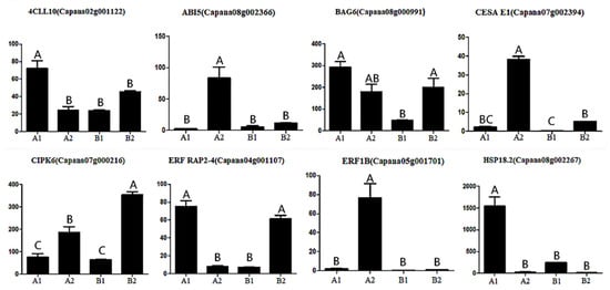In order to verify the results of ISO SEQ, eight selected genes (4CLL10, ABI5, BAG6, CESA E1, CIPK6, ERF RAP2-4, ERF1B, and HSP18.2) were analyzed by qRT-PCR with gene-specific primers. The transcriptional abundance patterns of three pepper fruits were calculated. When evaluated by real-time RT-PCR, qRT-PCR analysis showed a similar trend in transcript abundance (Figure 11), thus confirming that the FPKM value of each transcript determined by ISO SEQ was reliable in this study.