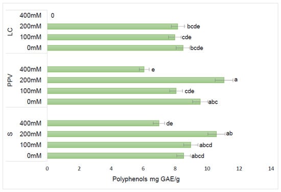 Influence of salinity (NaCl) and growth medium on the polyphenol content of T. ciliata. The mean values with different letters are significantly different at p ≤ 0.05. n = 10 replicates.