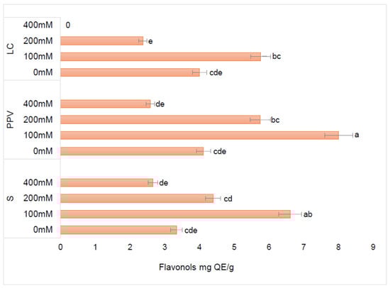 Influence of salinity (NaCl) and soilless media on flavonol content. The mean values with different letters are significantly different at p ≤ 0.05. n = 10 replicates.