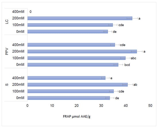 Influence of salinity (NaCl) and soilless media of FRAP. The mean values with different letters are significantly different at p ≤ 0.05. n = 10 replicates.
