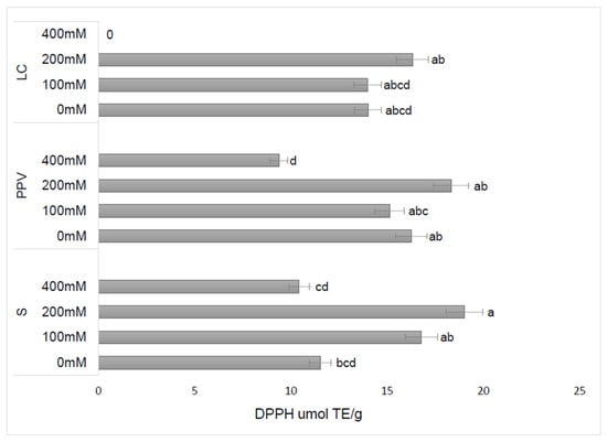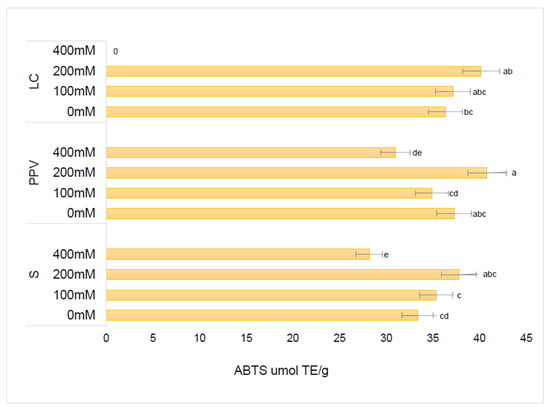 Results of this experiment also revealed that both salinity and soilless media had a significant effect on the ABTS values. Figure 6 shows that the 200 mM salt concentration had the highest values in PPV (40.79 μM TE/g DW) and lowest in the sand with 400 mM. Results further showed significant variability in ABTS capacity in all concentrations tested between soilless media.