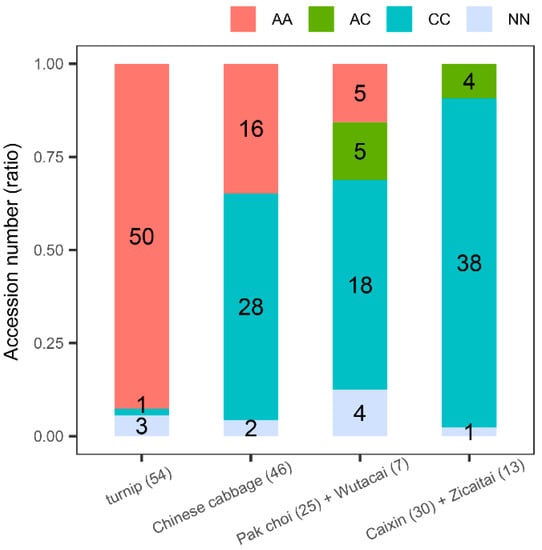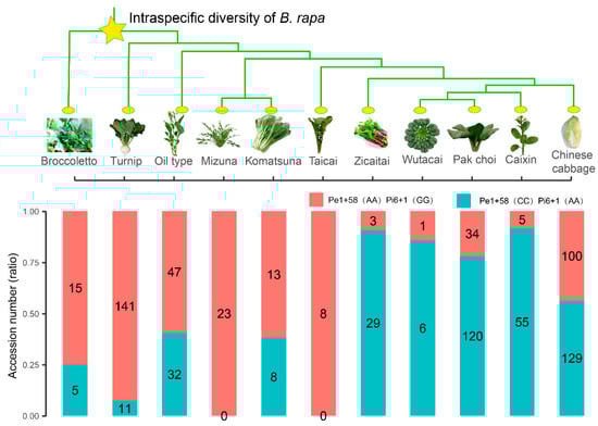 Frequency distribution of Pe1+58(A/C) genotypes in different B. rapa cultivar groups.
