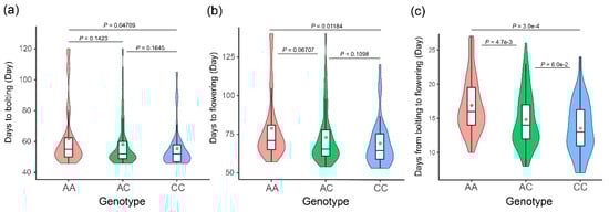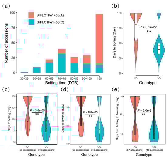 Among the 236 accessions, 112 were Chinese cabbages (ssp. pekinensis). In contrast to the distribution bias for the BrFLC1Pe1+58 (A/C) allele in the groups of turnip, caixin, or pak choi, the Chinese cabbage had comparable frequencies of the two alleles. The frequencies in the Chinese cabbage group were 50%, 42%, and 8% for AA, CC, and AC plants, respectively. The DTB and DTF of Chinese cabbages with AA allele were significantly longer than those of accessions carried CC allele (Figure 2c,d). The accessions with AA alleles also took significantly longer from bolting to flowering (Figure 2e). This result further confirmed that this natural mutation is related to variation in flowering time.