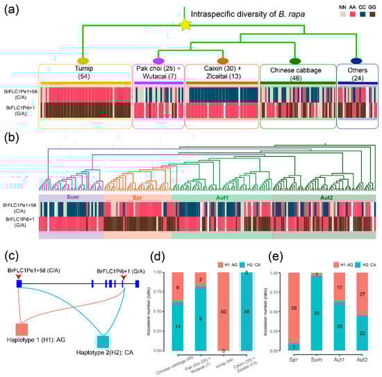 Distribution of haplotypes comprising BrFLC1Pe1+58 (A/C) and BrFLC1Pi6+1 (G/A) in different B. rapa subspecies. (a) Genotype distribution of BrFLC1Pe1+58 (A/C) and BrFLC1Pi6+1 (G/A) in a germplasm collection of 199 accessions [16]; (b) Genotype distribution of BrFLC1Pe1+58 (A/C) and BrFLC1Pi6+1 (G/A) in a collection of 192 Chinese cabbage accessions [18]; (c) Schematic model of haplotypes BrFLC1Pe1+58 (A/C) and BrFLC1Pi6+1 (G/A); (d) haplotype distribution in 120 of 199 B. rapa germplasm accessions; (e) haplotype distribution in 152 of 192 Chinese cabbage accessions. In (d,e), the accessions carrying heterozygous alleles in either BrFLC1Pe1+58 (A/C) or BrFLC1Pi6+1 (G/A) were not included.