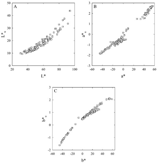 The uncalibrated colourimeter’s L*, a* and b* were related to the reference L*, a* and b*—i.e., obtained with the spectrophotometer—by quadratic relationships, as suggested by scatterplots in Figure 3. The quadratic models had R2 > 0.9 (Table 1) and were used to calibrate the L*, a* and b* measurements obtained with the colourimeter from the uncalibrated readings (i.e., L*u, a*u and b*u). The calibration algorithms were loaded onto the colourimeter’s firmware so that the output data was pre-processed with the correction.
