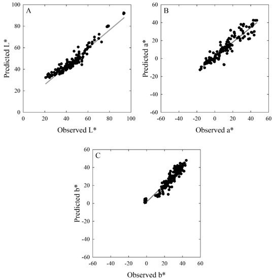 Scatter plots of validation datasets of colourimeter’s L* (A), a* (B) and b* (C) (predicted) against reference spectrophotometer’s L*, a* and b* (observed), respectively.