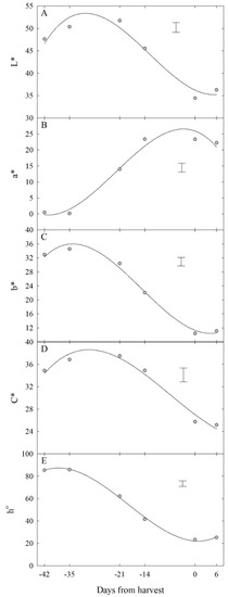 Cubic regression fits of skin L* (A), a* (B), b* (C), C* (D) and h° (E) against time (n days from harvest) in ‘Majestic Pearl’ nectarine fruit. Significant differences are shown with Fisher’s Least Significant Difference (LSD, 5%) bars.