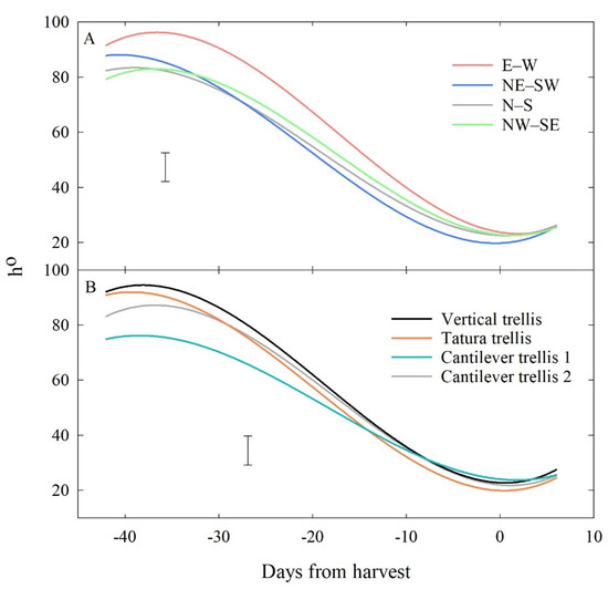 Cubic models of skin hue angle (h°) against time (n days from harvest) in ‘Majestic Pearl’ nectarine fruit subjected to different row orientations (A) and training systems (B). Significant differences are shown with Fisher’s Least Significant Difference (LSD, 5%) bars.