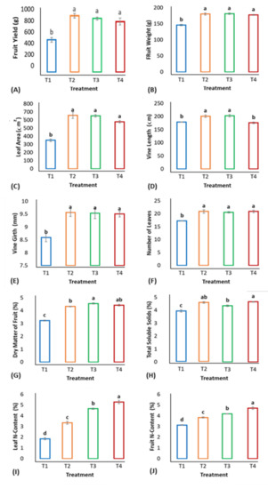 Graphical representation compares productivity-enhancing traits including Fruit Yield (A), Fruit Weight (B), Leaf Area (C), Vine Length (D), Vine Girth (E), Number of Leaves (F), Dry Matter (G), Total Soluble Solid (H), Leaf N-Content (I), and Fruit N-Content (J) in cucumber under soilless culture through Tukey–Kramer (HSD) test. Treatments sharing common letters revealed non-significant differences, and different letters depict significant differences (p < 0.05).