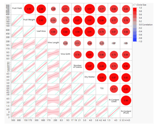 The correlation of parameters investigated with each other represented in Figure 3 depicts a significant positive correlation. All the traits except vine length significantly depend on each other for better performance [65]. All the quality parameters positively correlate with yield parameters and ultimately increase the net yield [66,67]. Maximum correlations were observed for dry matter with fruit yield per plant, fruit weight, and leaf area. This indicates the interdependence of dry fruit matter on traits under study contributing to yield. Our findings follow those of previous studies [42,65,68,69,70,71].