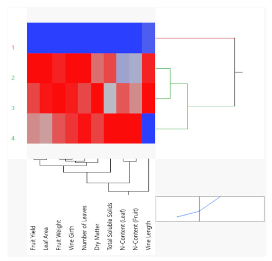 Multivariate analysis was performed to further validate the outcome obtained from the univariate method used to distinguish the augmented treatments from conventional ones. The clustering of traits was done based on the discrimination among four treatments depicted in the form of a heat map in Figure 4. The hierarchical clustering was operated using morphological traits data from different treatments via the agglomerative approach. This approach was based on squared Euclidean distance between treatments using Ward’s method. This heat plot discriminates the control T1 from the rest of the augmented treatments T2, T3, and T4, forming two clusters. The two treatments T2 and T3 depicted productivity and quality-enhancing outcomes, respectively.