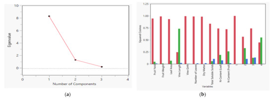 (a) Scree plot reveals the number of components covering sufficient variation related to treatments used for investigated traits. (b) Squared cosines associated with the principal components for ten investigated traits and four treatments.