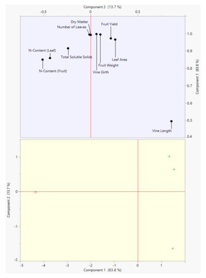 Biplot matrix for principal component analysis revealing the distribution of traits in question under treatments. The upper half of the matrix represents traits, while the lower half depicts treatments placed at different places of the scatterplot.