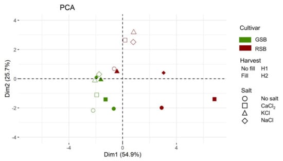 The plot revealed that samples were separated coherently with the genotype along the first principal component (PC). Moreover, the distribution of the RSB samples along PC1 and PC2 was much wider compared to the GSB samples, indicating a more variable response to the experimental factors. The multidimensional reduction also highlighted another difference between the cultivars. While the salt treatment mainly separated experimental conditions of the GSB along the second principal component, the factor Harvest mainly distributed samples along PC1, with those of the second harvest shifted toward less negative values compared to those of the first harvest. This resulted in a coherent clustering of the GSB samples, with, for instance, the no-salt treatment having the higher (negative) values along PC2. The response of the RSB to the experimental condition was more complex. For instance, the factor Harvest separated the RSB samples along the two main components. Moreover, at the second harvest, RSB samples are more dispersed. Overall, the multivariate analysis indicated that a large proportion of the variance can be linearly explained by two main components, with sorting of the samples strongly influenced by the genotype (e.g., cultivars were fully separated). The variation due to the saline treatments between the two cultivars was different, with a more linear and tight ordination for the GSB.