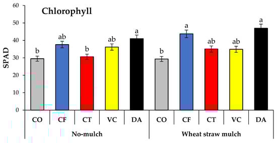Effect of organic amendments and mulching system on chlorophyll (SPAD) in the leaves of squash plants. CO = Control (without fertilization), CF = Recommended mineral fertilization (112 kg N ha−1 + 50 kg P2O5 + 75 kg K2O ha−1), CT = Compost (7.5 t ha−1), VC = Vermicompost (7.5 t ha−1), DA = Dry Azolla pinnata (3.75 t ha−1). Different letters indicate significant differences according to Duncan’s multiple range test at p ≤ 0.05. Data are means of three replicates ± SE.