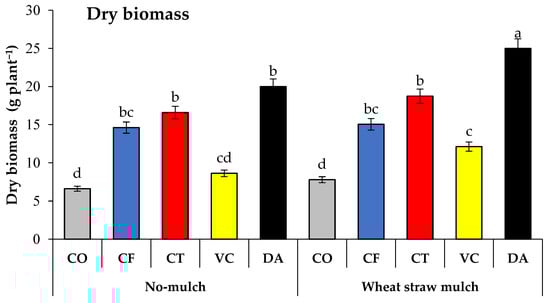 Covering the soil with wheat straw mulch caused significant increases in the growth of squash plants (Figure 1 and Figure 2). Squash plants grown under the wheat straw mulch had the highest chlorophyll (SPAD) and dry biomass weight. In most cases, the highest value of chlorophyll (SPAD)was observed with the application of DA and CF with and without wheat straw mulch. On the other hand, the lowest value of chlorophyll (SPAD) was recorded for CO with or without wheat straw mulch (Figure 1). The application of recommended mineral fertilization (CF), compost (CT), vermicompost (VC), and dry Azolla (DA) under the wheat straw mulch increased the dry biomass by 93, 141, 56, and 203%, respectively, above the control, while these organic fertilizers without mulching increased the dry biomass by 121, 151, 31, and 220%, respectively, above the control (Figure 2). The highest significant values of growth and chlorophyll (SPAD) were recorded in the soil treated with dry Azolla and covered with wheat straw.