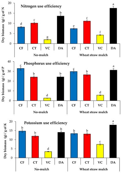 Nutrient use efficiencies significantly affected by the application of the fertilization treatments and wheat straw mulching are shown in Figure 3. The highest significant values of N, P, and K use efficiencies were recorded in the plants amended with DA under wheat straw mulching, while the lowest values were found in the VC under no mulching treatment. Nitrogen, phosphorus, and potassium were used efficiently when dry Azolla was added under wheat straw mulching.