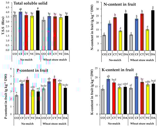 The quality of squash fruit was evaluated and the data are shown in Figure 4. The highest total soluble solid (4.17 Birx) was found in the case of DA without mulching, while the lowest was found in the control with mulching. N content in the fruit reached the highest (29.05 g kg−1 DW) value with DA and mulching, while the lowest (11.03 g kg−1 DW) was found in the case of the control without mulching. The highest K content in the fruit (20.45 g kg−1 DW) was found with CF and mulching, while the lowest (13.56 g kg−1 DW) with the control without mulching.