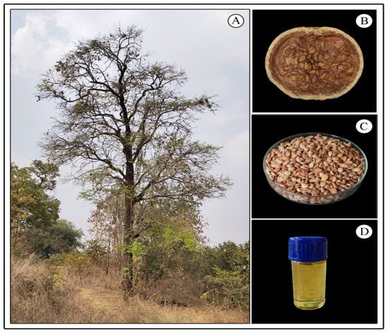 Wood apple (Limonia acidissima L.) is an underutilized fruit-yielding tree species native to India and Sri Lanka (Figure 1A). Wood apple (Figure 1B) is used by the tribal and rural population of the developing world, which contributes to the traditional health system []. Extracts of wood apple are used traditionally for curing various diseases, such as antimicrobial, antifungal, liver, and cardiac tonic, dysentery, hiccough, sore throat, and is a good antidote for snakebite and used as a face cream to remove small spots and lesions on the skin. The phytochemical analysis of L. acidissima plant parts showed the presence of alkaloids, flavonoids, phenols, terpenoids, tannins, fats, sterols, saponins, glycosides, gum, mucilage, and fixed oils [,]. The small, numerous, and white seeds scattered throughout fruits(Figure 1C) showed an abundance in protein, carbohydrate, amino acid content and high amount of iron (Fe), zinc (Zn), sodium (Na), potassium (K), phosphorus (P), copper (Cu), magnesium (Mg) and manganese (Mn) []. However, no detailed reports are available on wood apple seed oil (Figure 1D). Therefore, the present study was aimed atanalyzing the fatty acid composition by GC-MS, tocopherols by HPLC/FD, and physico-chemical properties of seed oil, and nutritional analysis of wood apple seed cake.