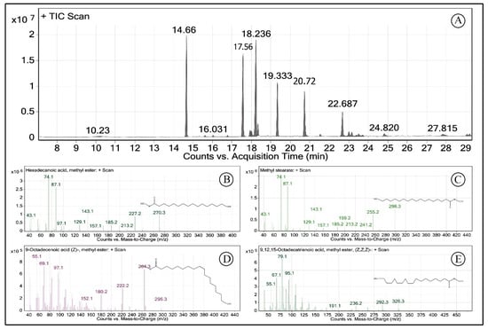 GC-MS chromatograms of wood apple (Limonia acidissima L.) seed oil fatty acid methyl esters (FAMEs) (A) and MS spectra of major FAMEs of analyzed fatty acids. Methyl palmitate (B), methyl stearate (C), methyl oleate (D), methyl linolenate (E).