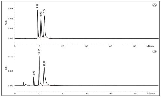 HPLC/FD chromatograms of tocopherol standards (A) and wood apple (Limonia acidissima L.) seed oil (B). Standard peak at RT-9.54 is δ-Tocopherol, peak RT-10.92 is γ-Tocopherol, and peak RT-12.25 is α-Tocopherol.