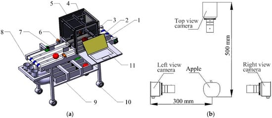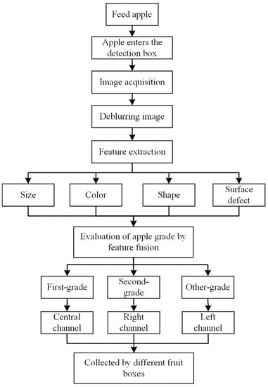 Table 1. The final grade of the apples is based on the lowest grade of a single characteristic, such as the size, color, shape, and surface defect of the apples. Three levels were used: first-grade, second-grade, and other-grade fruit. The apple size was the maximum cross-sectional diameter of the apple. The apple color was characterized by the ratio of the red area to the total apple surface area.