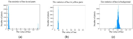 Figure 3a), the hue ranges of the background parts were [50, 125] (as shown in