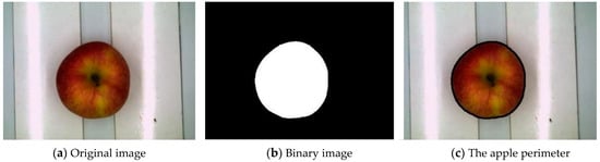 ith pixel is within the red threshold range; otherwise, it is 0. The red threshold ranges from [0, 15] to [175, 180]. The red area ratios of the hue values of the apple images obtained by both cameras were calculated and averaged to describe the color of the apple. The value ranges from 0 to 1, and the closer it is to 1, the redder the apple is.