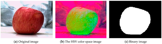 Figure 3b). Thus, the ratio of the red area was used to describe the color of the apple. The ratio of the red area is the ratio of the number of red pixels in the hue to the total number of pixels in the apple area: